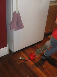 I came along this situation and realized it needed a picture and blog entry. One of the babies(Rosi ?) decided it was time for ice cream. They got the bowl out of the cupboard, the scoop out of the dishwasher and planted it right next to the refrigerator. I grabbed the camera when a big brother (Andrew) came swooping through, so I think it just adds to the whole story!